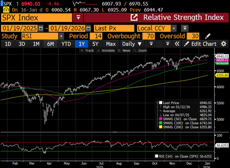 风格轮动与广度改善:顺周期与风险偏好交易仍是当前主线,工业、材料、能源以及可选消费相对大型成长/科技板块持续跑赢,去年末形成的“再通胀交易”在新年得以延续,小盘和价值风格阶段性占优;普成分股中超六成为年初以来跑赢大盘,类似水平自本世纪初以来并不常见,反映资金正在从“七巨头”集中度极高的结构向更均衡的多点开花转变。